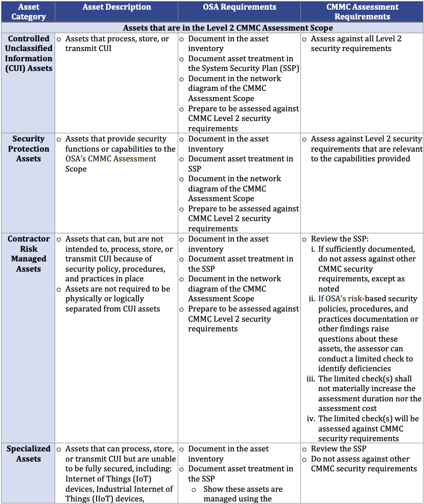 After identifying assets, each one must be classified using the CMMC Scoping Guide. Assets fall into one of five categories: CUI Assets, Security Protection Assets, Contractor Risk Managed Assets, Specialized Assets, or Out-of-Scope Assets. This structured approach reduces confusion, ensures alignment with CMMC requirements, and has direct implications for the number of controls you must implement. Correct classification is critical for planning and cost management.