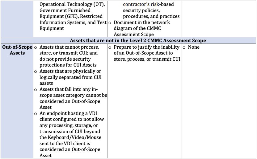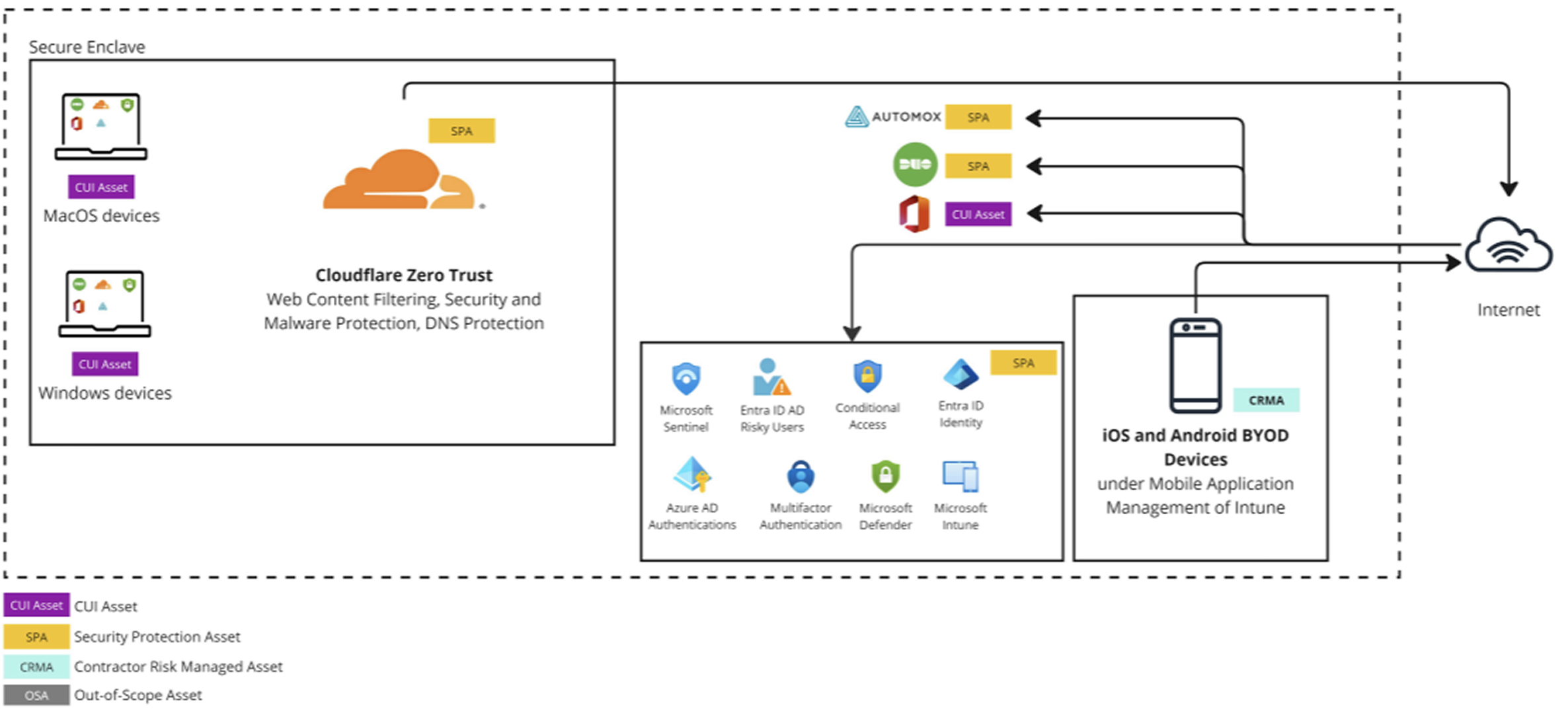 Once the flow of CUI is clear, the next task is to create a scoping diagram that lists all IT assets that process, store, transmit, or protect CUI. Examples include email servers, SaaS products, local file servers, Git repositories, and SolidWorks servers. A visual diagram provides assessors and internal teams with a clear picture of your environment and can reveal opportunities to reduce scope by isolating CUI away from systems that don’t need to be included.